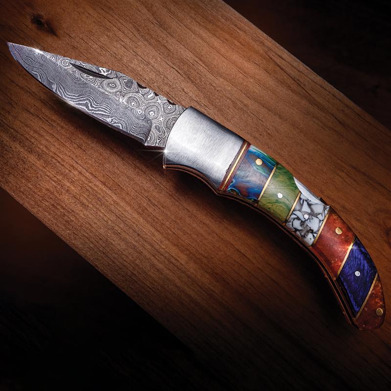 The Damascus Folding Knife is a 3" blade of modern Damascus steel, inspired by the stories and production techniques of old. Made from a mix of steel alloys and featuring the identifiable Damascus steel pattern, the blade folds into a handle with a striking color block motif. And, at this price, the blade of Damascus steel is a steal.