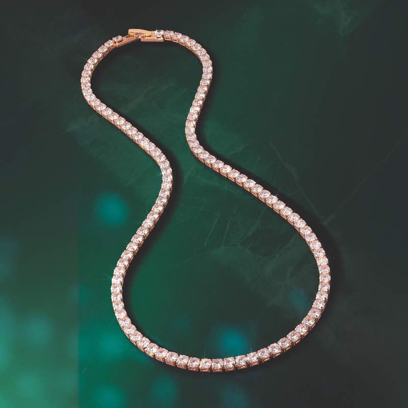 This 45-carat tennis necklace redefines luxury at an unbeatable value, offering elegance and sparkle for an incredible price. Each DiamondAura® stone is expertly cut to maximize shine, creating a piece that looks far more expensive than its price. Designed for both style and comfort, the necklace lays smoothly on the neckline, catching the light beautifully with every movement. Perfect for elevating any outfit, it’s ideal for those seeking affordable glamour without compromising on quality. Whether for daily wear or special occasions, this necklace is an exceptional find, delivering timeless allure and remarkable craftsmanship at a price that’s hard to believe. Available in both white DiamondAura®  stones in a 14k rose gold-finish and in pink DiamondAura® stones in a high gloss silver finish.