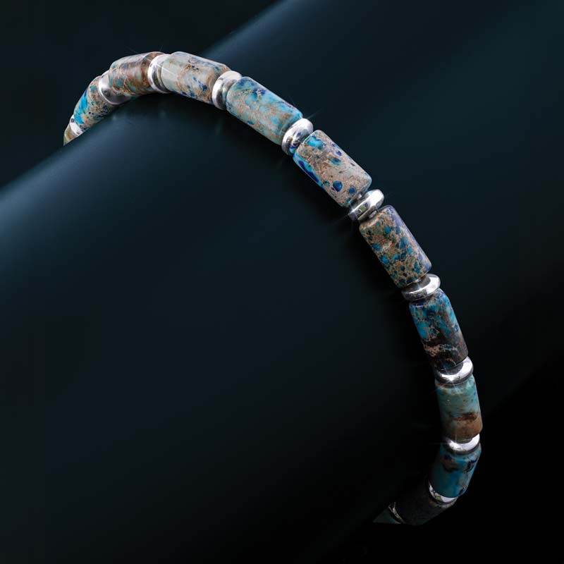 This new bracelet redefine sophistication with modern shapes of howlite beads and rhodium-finished spacers. Bold and angular, each bead is a sculptural statement — howlite for calm and clarity. The rich blues and cool whites offer a striking contrast that elevates any look, from casual to tailored. It’s a fusion of ancient stone and contemporary design, crafted for the person who values both meaning and unmistakable style.