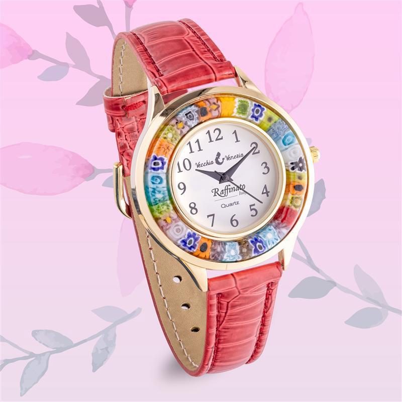 The Venezia Murano Watch flaunts a colorful glass bezel showcasing the famous millefiori, a Venetian glass-making technique that creates “a thousand flowers.” The Murano artisans fold layers of molten glass to create the vibrant flowers. Each multi-millefiore (which means a thousand flowers) bezel is handcrafted in a unique pattern— no two are alike.
